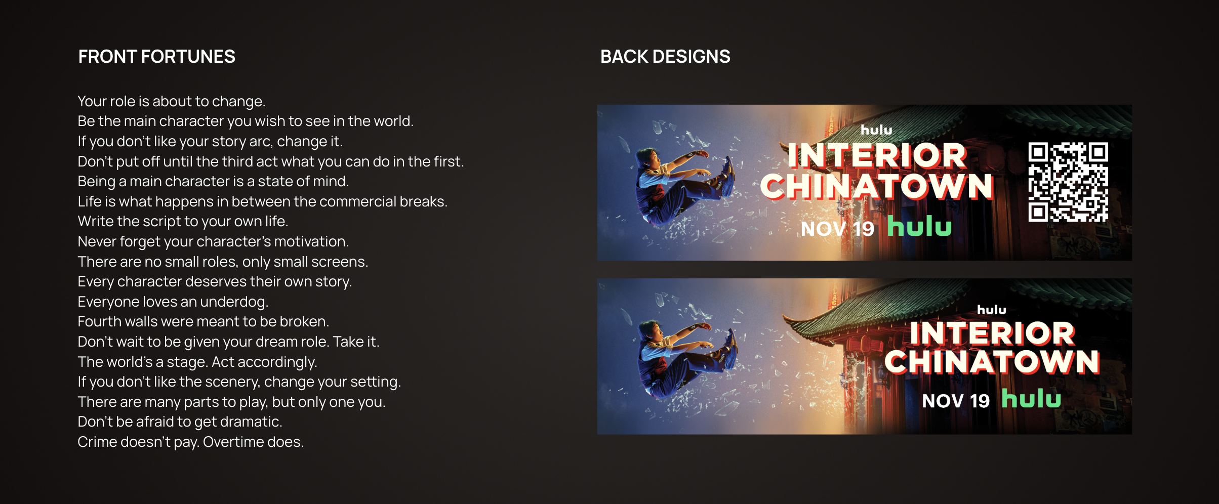 Hulu wanted to promote their brand new show ‘Interior Chinatown’ via fortune cookies. Content on Reels and Tiktok created to amplify the campaign.